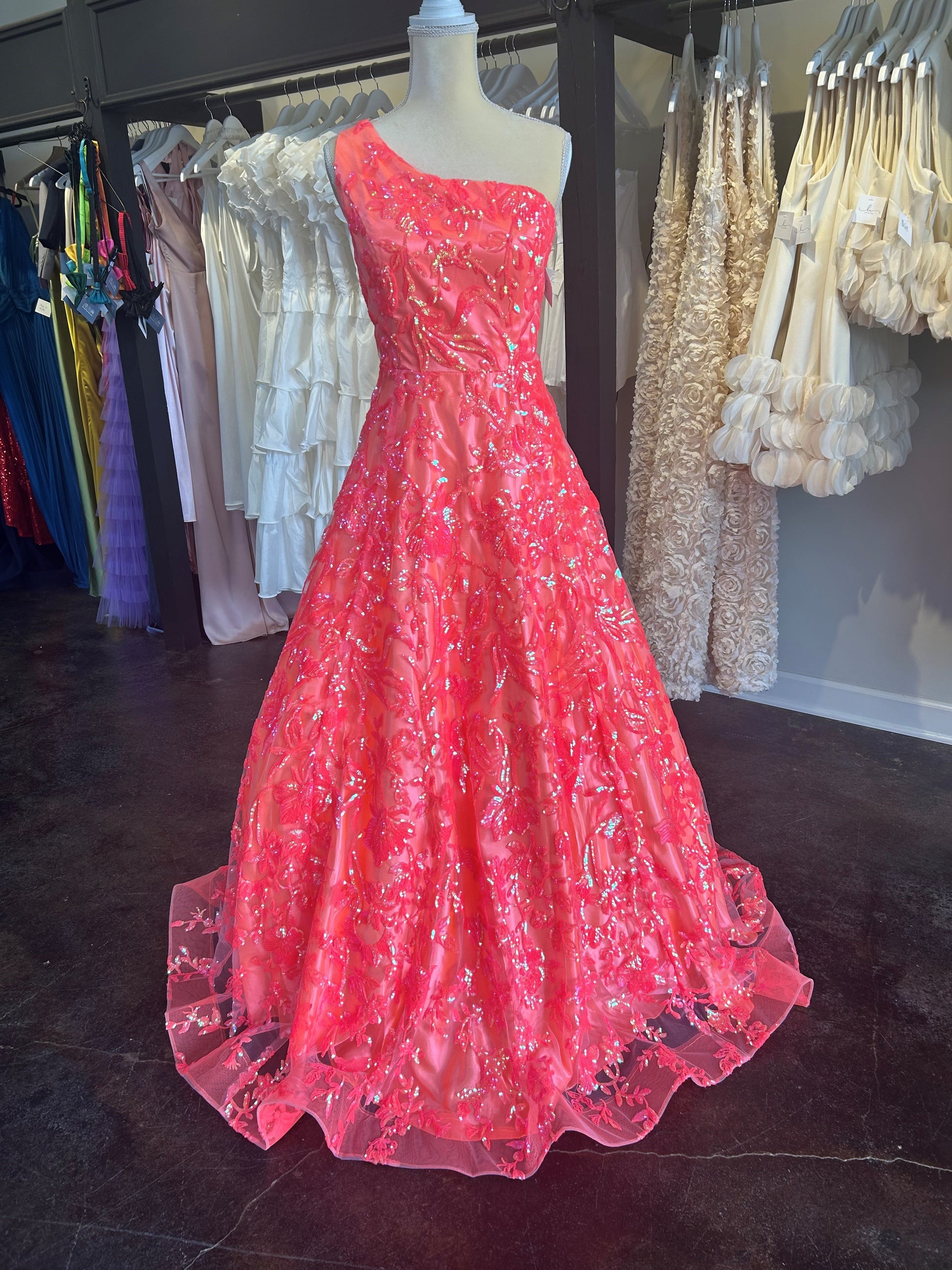 Make an entrance in the Electric Bloom Gown — a show-stopping one-shoulder masterpiece in vibrant neon coral. Covered in shimmering sequin floral detailing that catches the light from every angle, this dress is bold, bright, and built for the spotlight. With its full, flowing skirt and eye-catching color, it’s the perfect pick for prom, pageants, or any event where standing out is the only option.