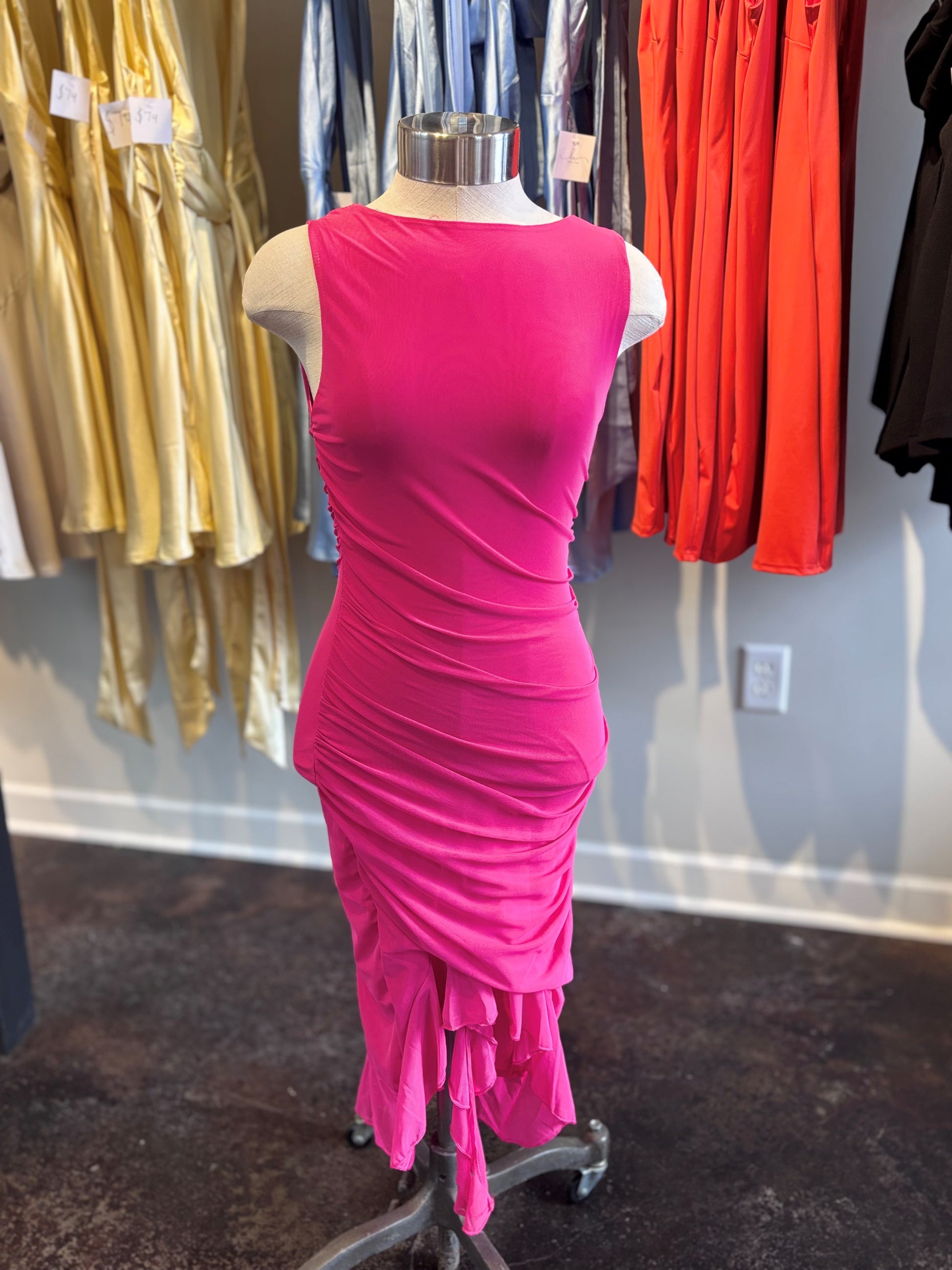 Make a statement in Hot Shot — a bold, body-hugging hot pink mini with a dramatic ruffle hem and sleek high neckline. Flirty, fierce, and ready for your next night out, this one’s for the girls who don’t mind all eyes on them.